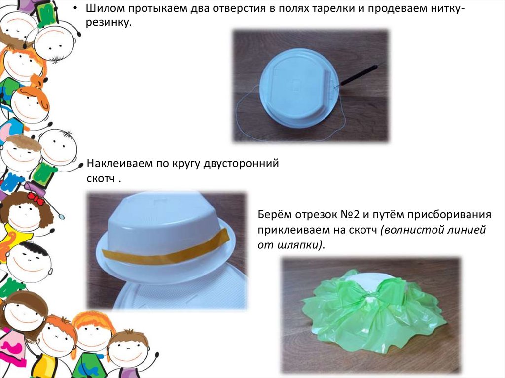 • Шилом протыкаем два отверстия в полях тарелки и продеваем ниткурезинку.Наклеиваем по кругу двусторонний
