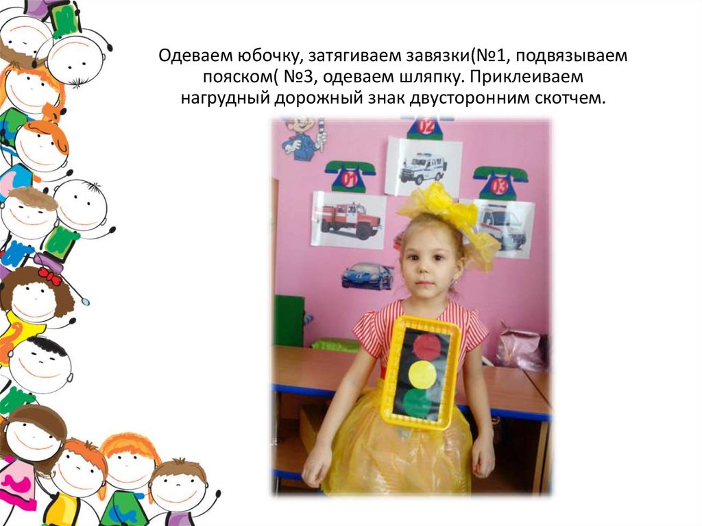 Одеваем юбочку, затягиваем завязки(№1, подвязываемпояском( №3, одеваем шляпку. Приклеиваем