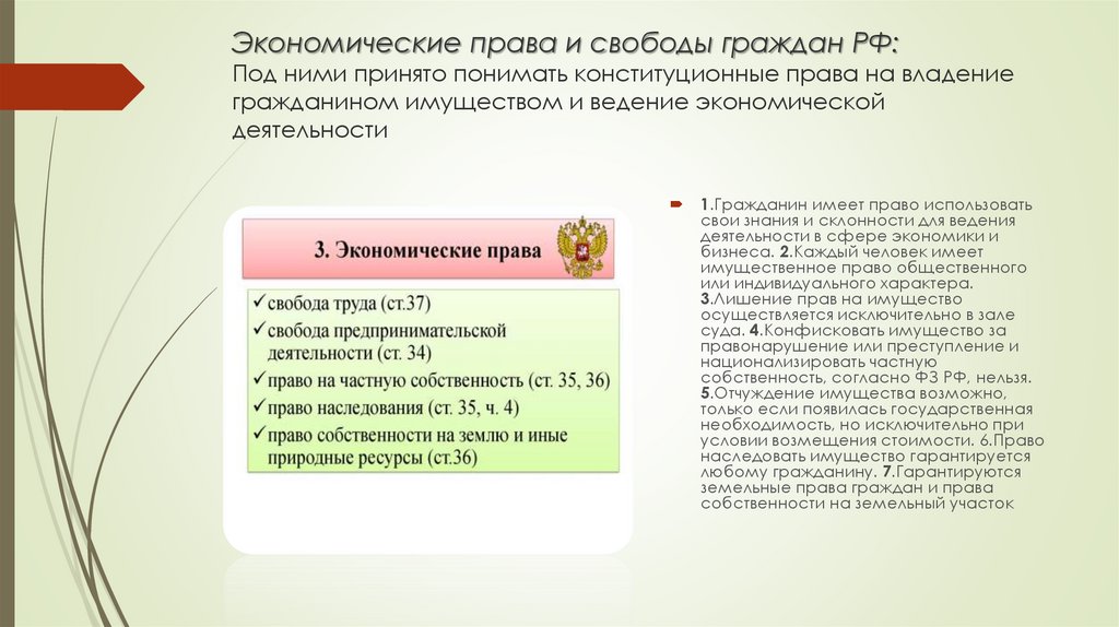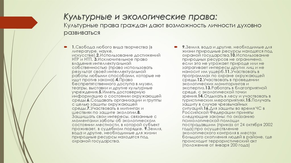 Культурные и экологические права:Культурные права граждан дают возможность личности духовно