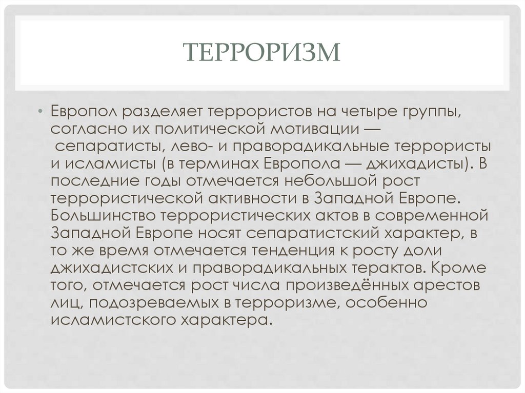 ТЕРРОРИЗМ• Европол разделяет террористов на четыре группы,
