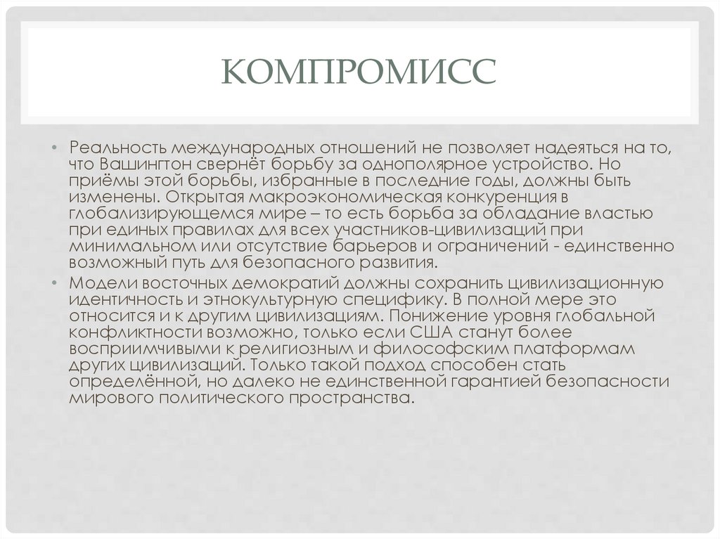 КОМПРОМИСС• Реальность международных отношений не позволяет надеяться на то,
