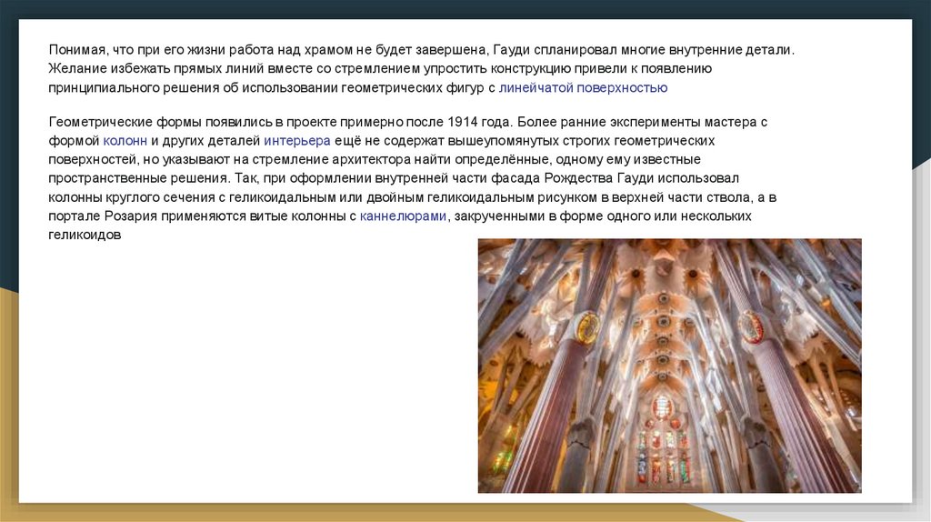 Понимая, что при его жизни работа над храмом не будет завершена, Гауди спланировал многие внутренние детали.Желание избежать прямых линий вместе со стремлением упростить конструкцию привели к появлению