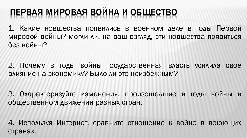 ПЕРВАЯ МИРОВАЯ ВОЙНА И ОБЩЕСТВО1. Какие новшества появились в военном деле в годы Первой