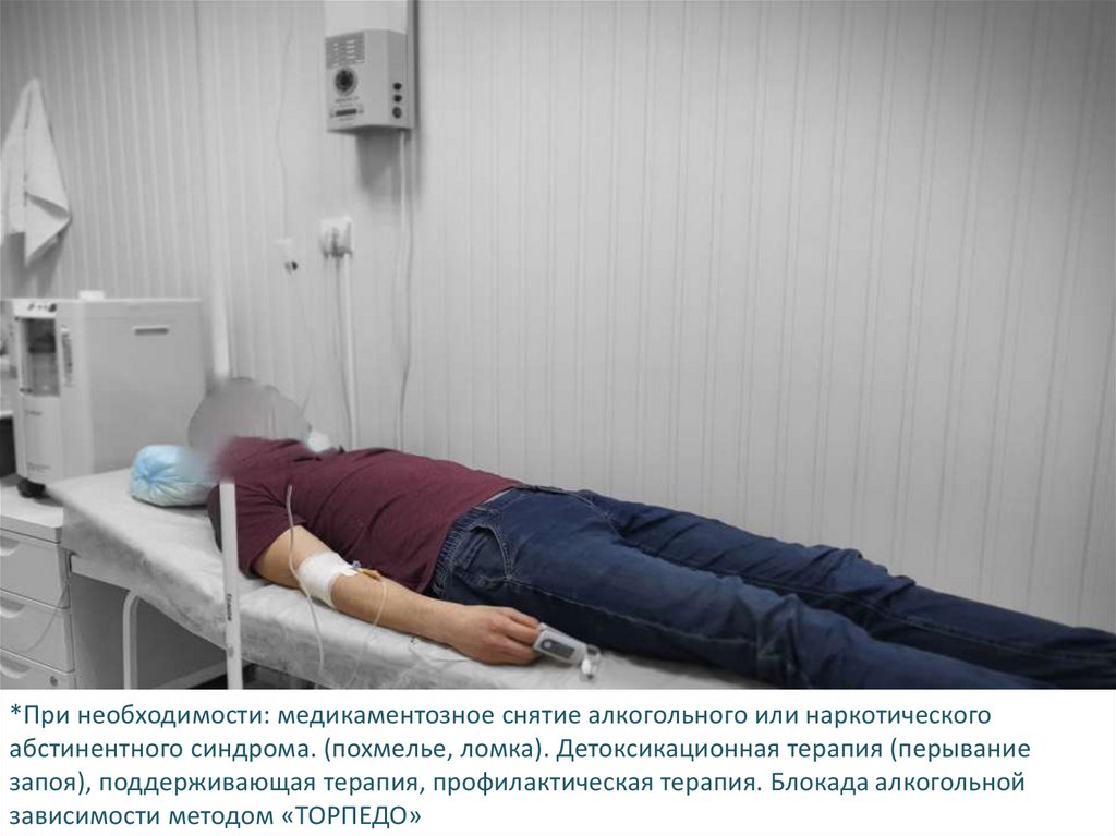 *При необходимости: медикаментозное снятие алкогольного или наркотическогоабстинентного синдрома. (похмелье, ломка). Детоксикационная терапия (перывание