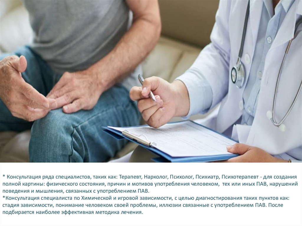 * Консультация ряда специалистов, таких как: Терапевт, Нарколог, Психолог, Психиатр, Психотерапевт - для созданияполной картины: физического состояния, причин и мотивов употребления человеком, тех или иных ПАВ, нарушений