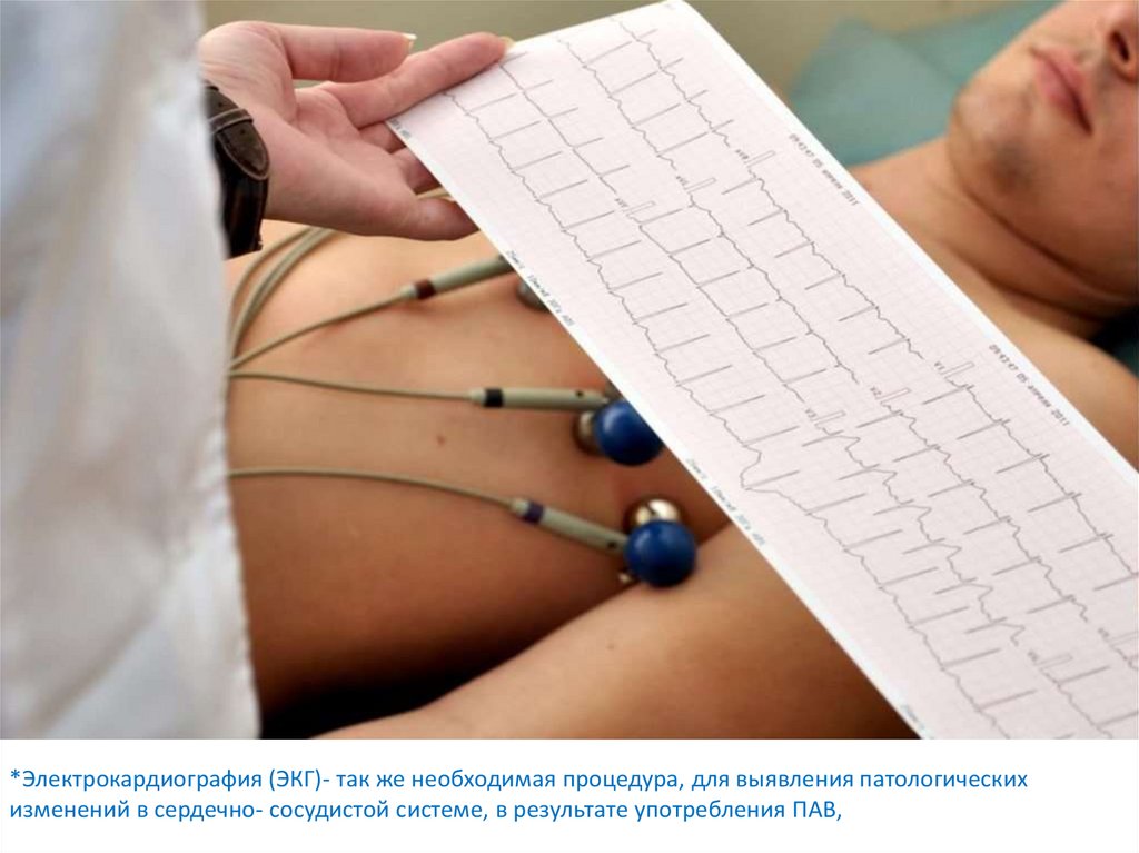 *Электрокардиография (ЭКГ)- так же необходимая процедура, для выявления патологическихизменений в сердечно- сосудистой системе, в результате употребления ПАВ,