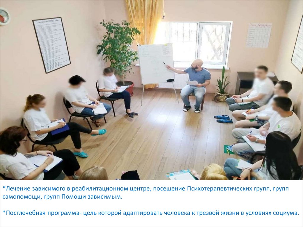 *Лечение зависимого в реабилитационном центре, посещение Психотерапевтических групп, группсамопомощи, групп Помощи зависимым.