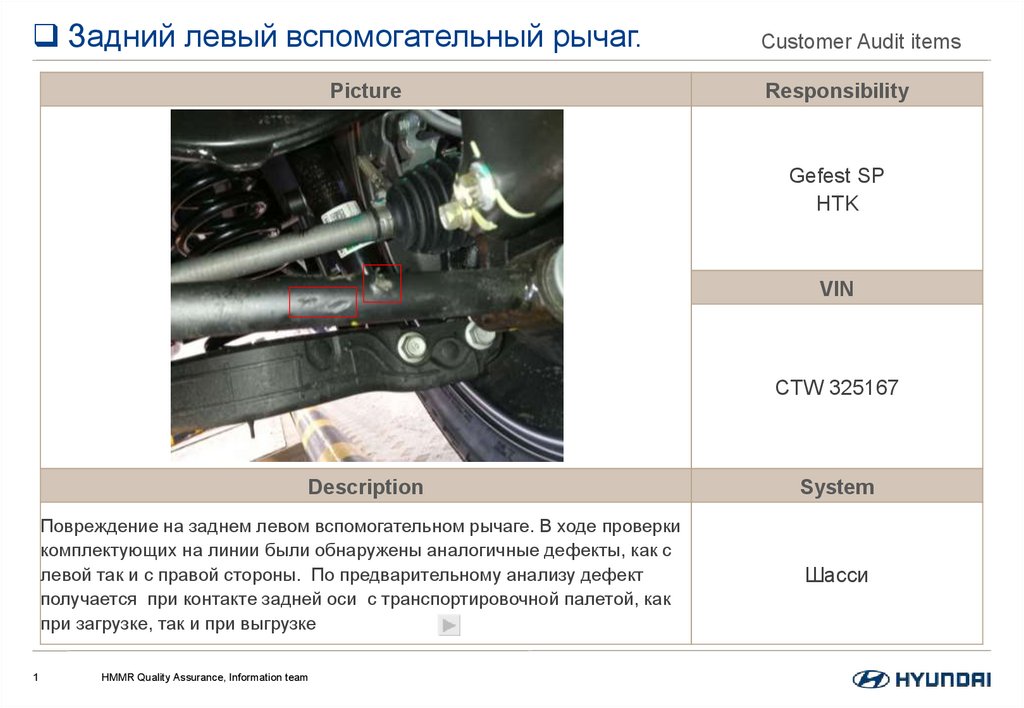 Повреждение на заднем левом вспомогательном рычаге. В ходе проверки