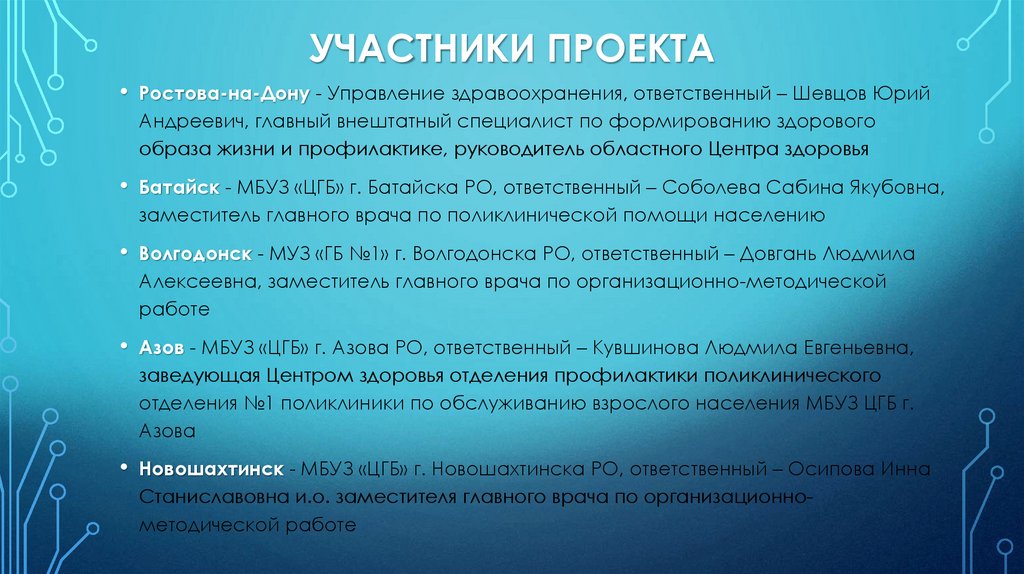 УЧАСТНИКИ ПРОЕКТАРостова-на-Дону - Управление здравоохранения, ответственный – Шевцов Юрий