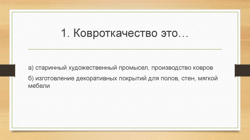 1. Ковроткачество это…а) старинный художественный промысел, производство ковров