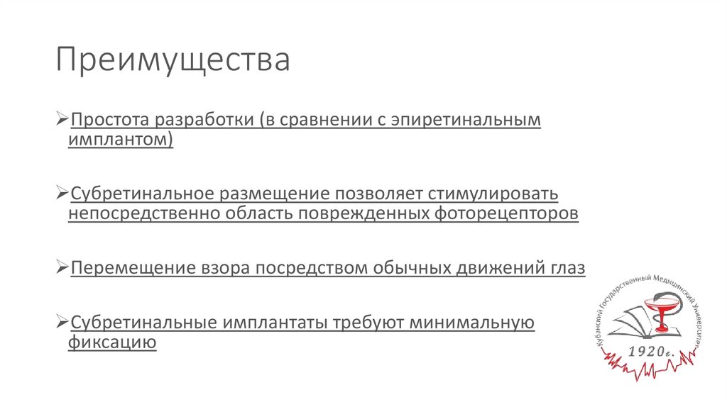 ПреимуществаПростота разработки (в сравнении с эпиретинальным