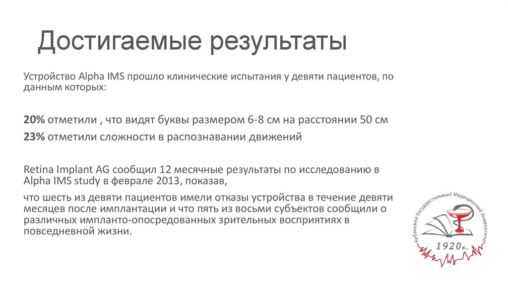 Достигаемые результатыУстройство Alpha IMS прошло клинические испытания у девяти пациентов, по