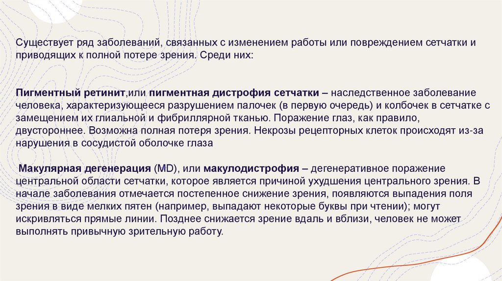 Существует ряд заболеваний, связанных с изменением работы или повреждением сетчатки иприводящих к полной потере зрения. Среди них: