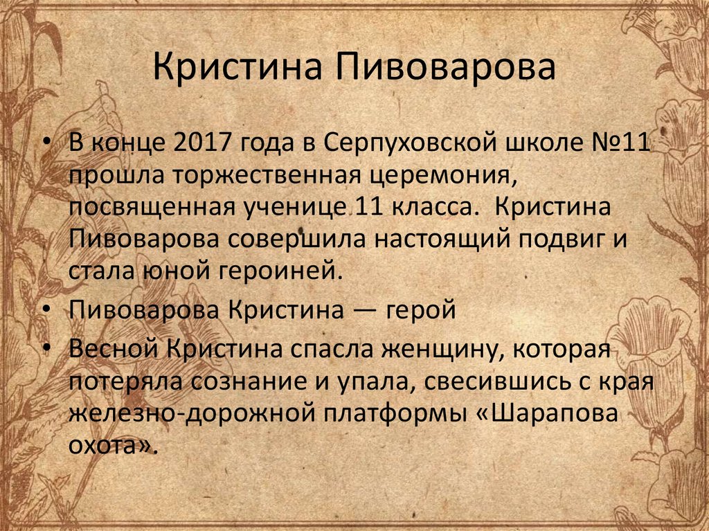 Кристина Пивоварова• В конце 2017 года в Серпуховской школе №11