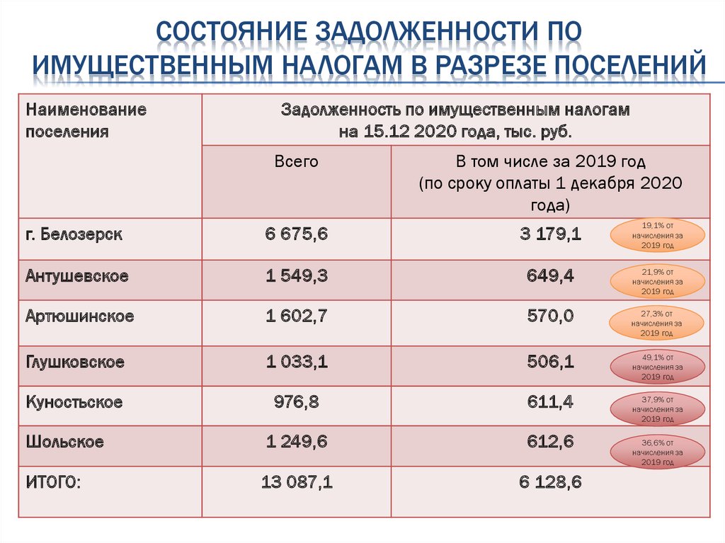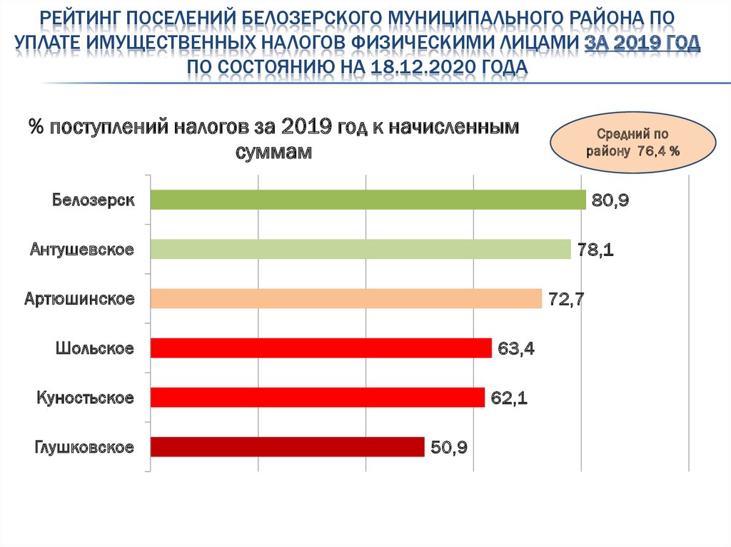 РЕЙТИНГ ПОСЕЛЕНИЙ БЕЛОЗЕРСКОГО МУНИЦИПАЛЬНОГО РАЙОНА ПОУПЛАТЕ ИМУЩЕСТВЕННЫХ НАЛОГОВ ФИЗИЧЕСКИМИ ЛИЦАМИ ЗА 2019 ГОД
