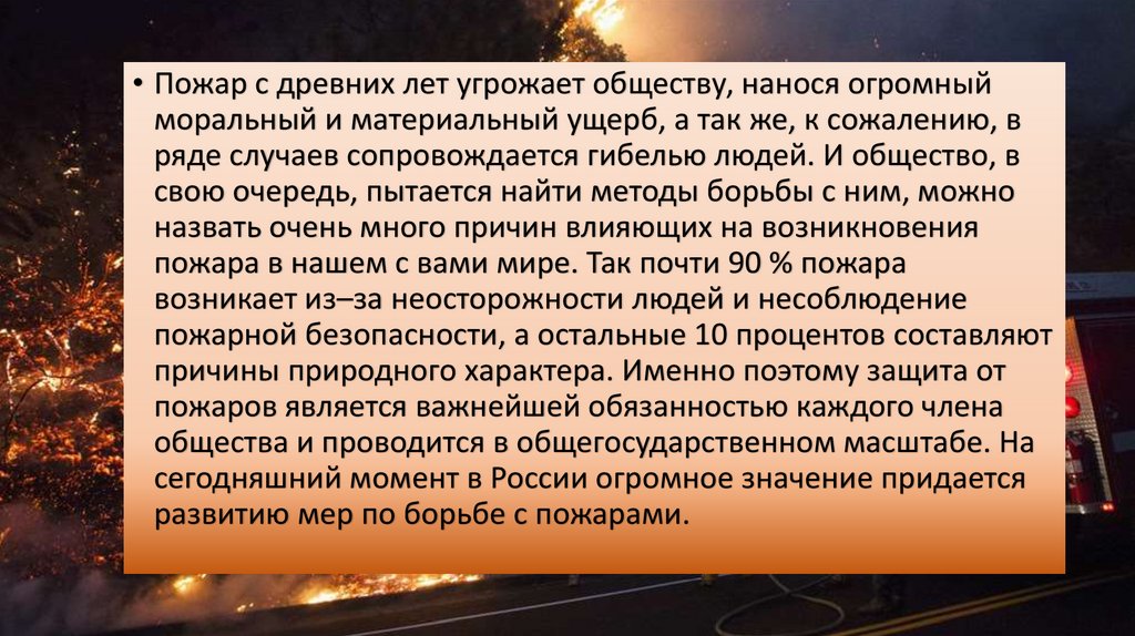 • Пожар с древних лет угрожает обществу, нанося огромныйморальный и материальный ущерб, а так же, к сожалению, в