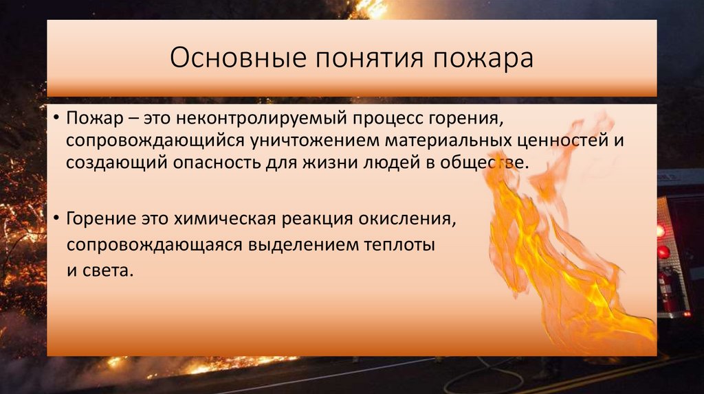 Основные понятия пожара• Пожар – это неконтролируемый процесс горения,