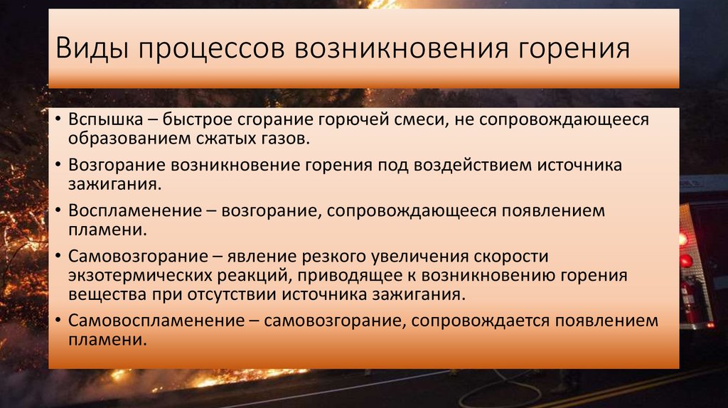 Виды процессов возникновения горения• Вспышка – быстрое сгорание горючей смеси, не сопровождающееся