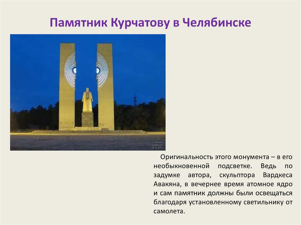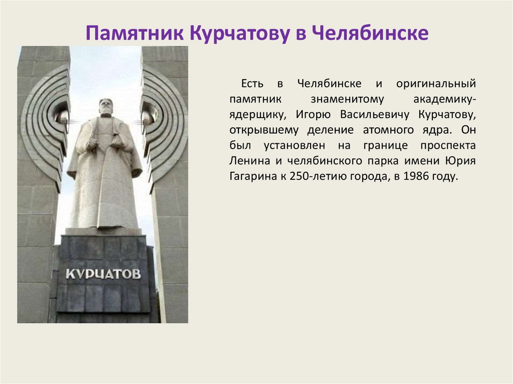 Памятник Курчатову в ЧелябинскеЕсть в Челябинске и оригинальный