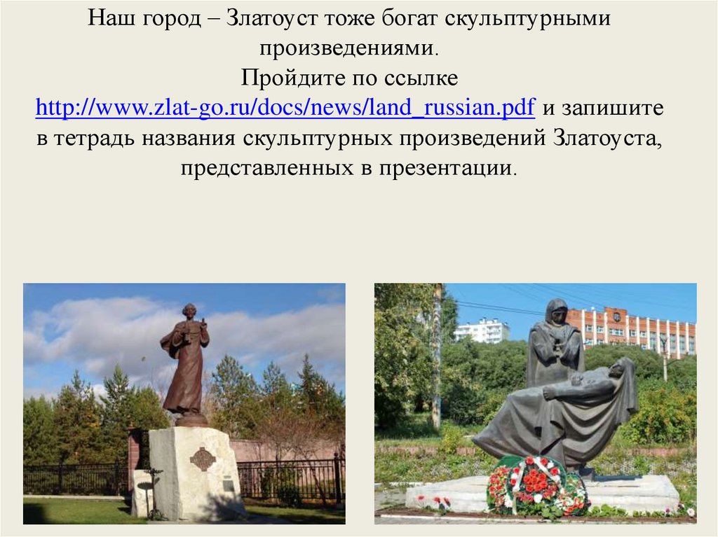 в тетрадь названия скульптурных произведений Златоуста,