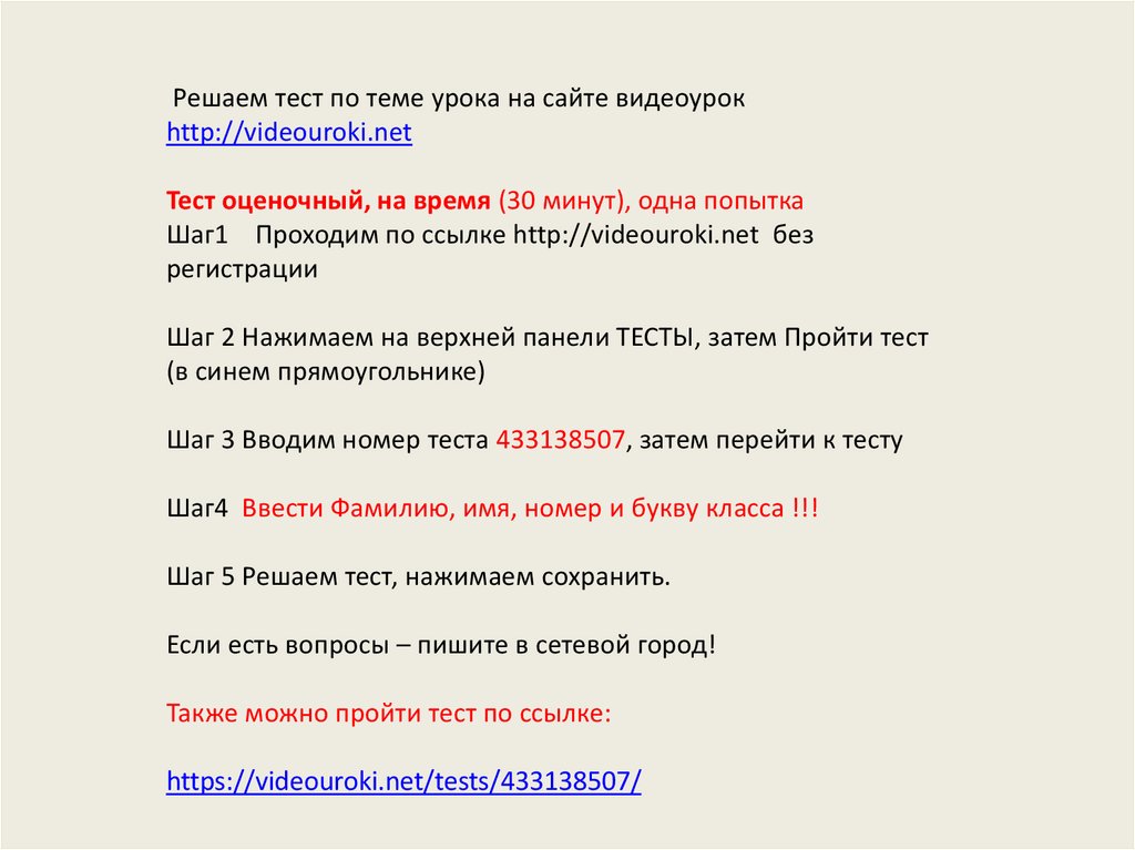 Решаем тест по теме урока на сайте видеоурокhttp://videouroki.net