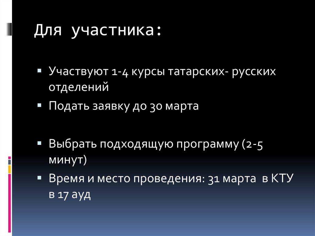 Для участника:Участвуют 1-4 курсы татарских- русских