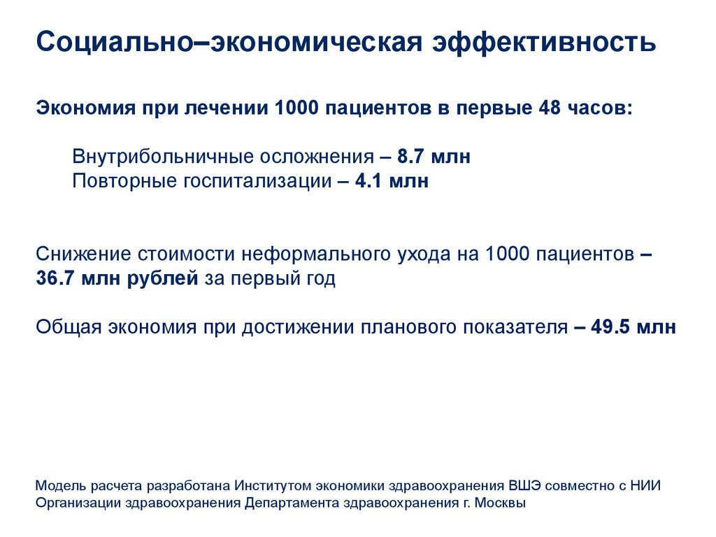 Социально–экономическая эффективностьЭкономия при лечении 1000 пациентов в первые 48 часов: