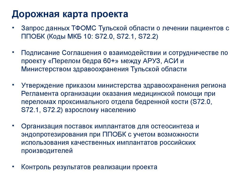 Дорожная карта проекта• Запрос данных ТФОМС Тульской области о лечении пациентов с