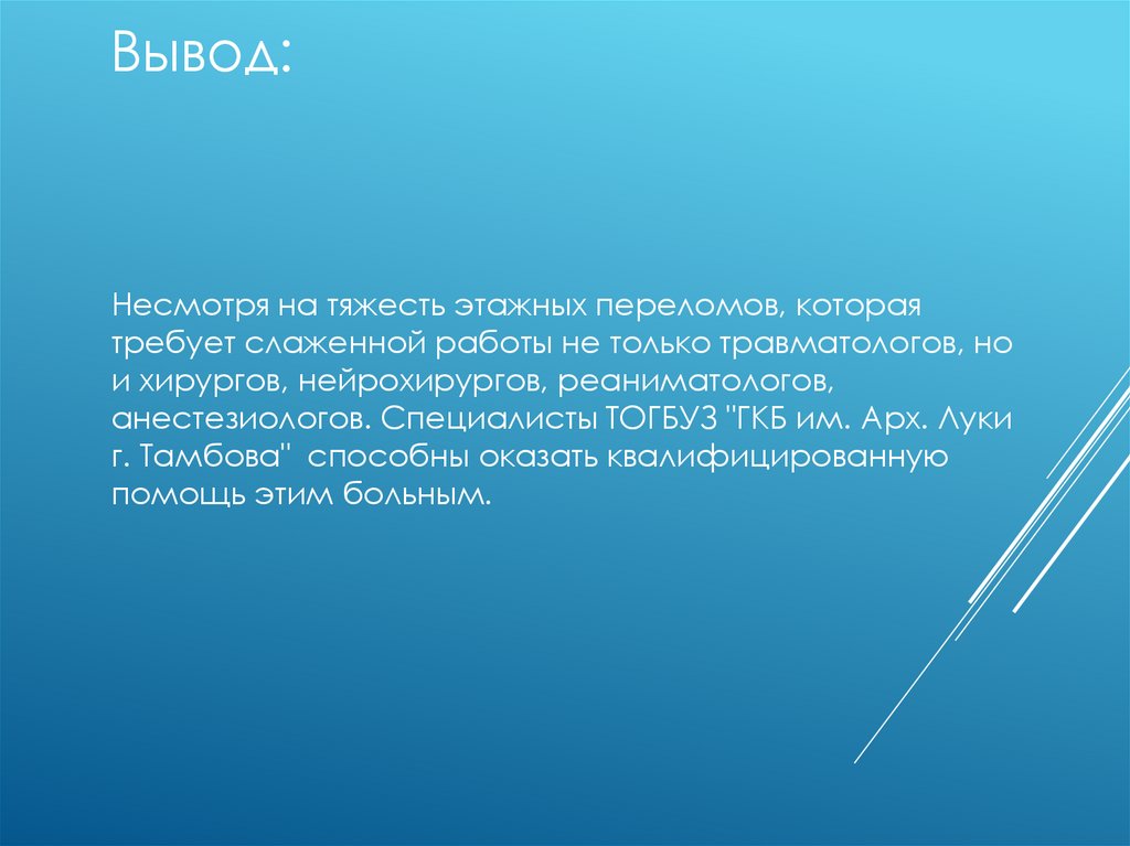 Вывод:Несмотря на тяжесть этажных переломов, которая