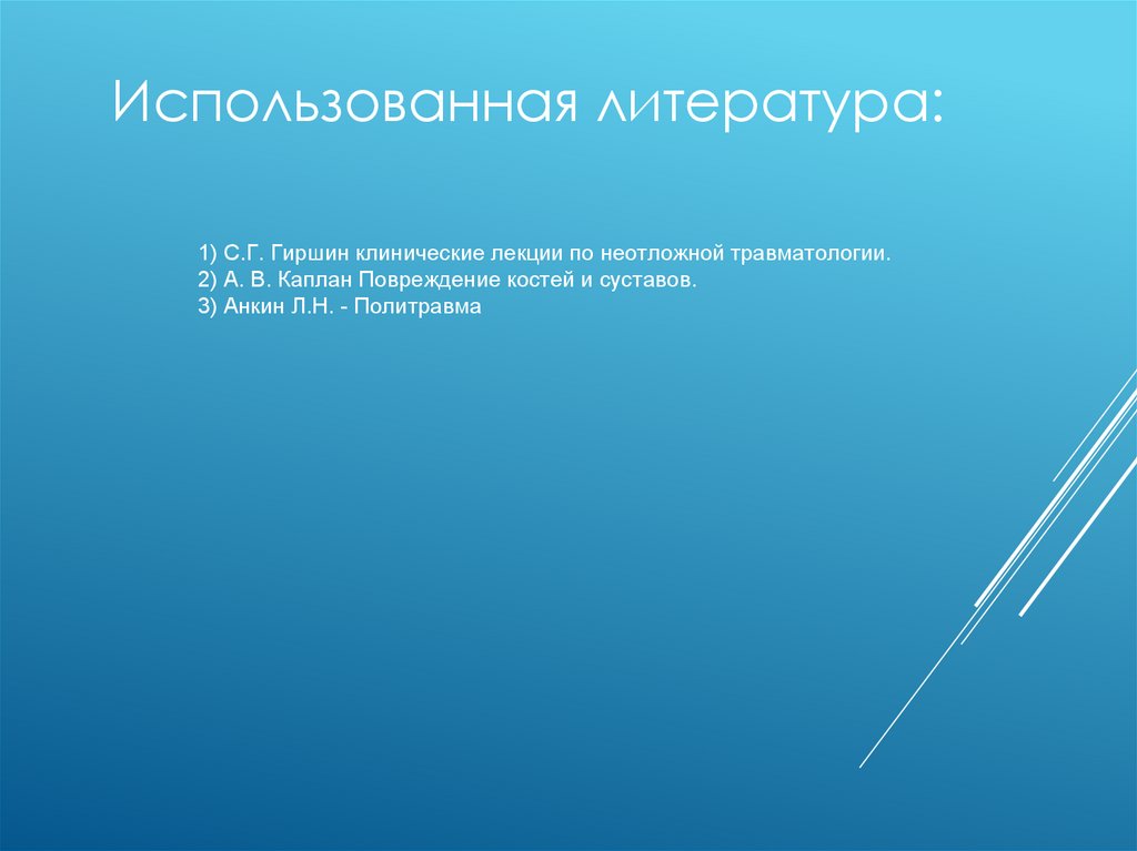 Использованная литература:1) С.Г. Гиршин клинические лекции по неотложной травматологии.