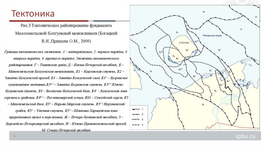 Границы тектонических элементов: 1 – надпорядковых, 2- первого порядка, 3второго порядка, 4- третьего порядка. Элементы тектонического
