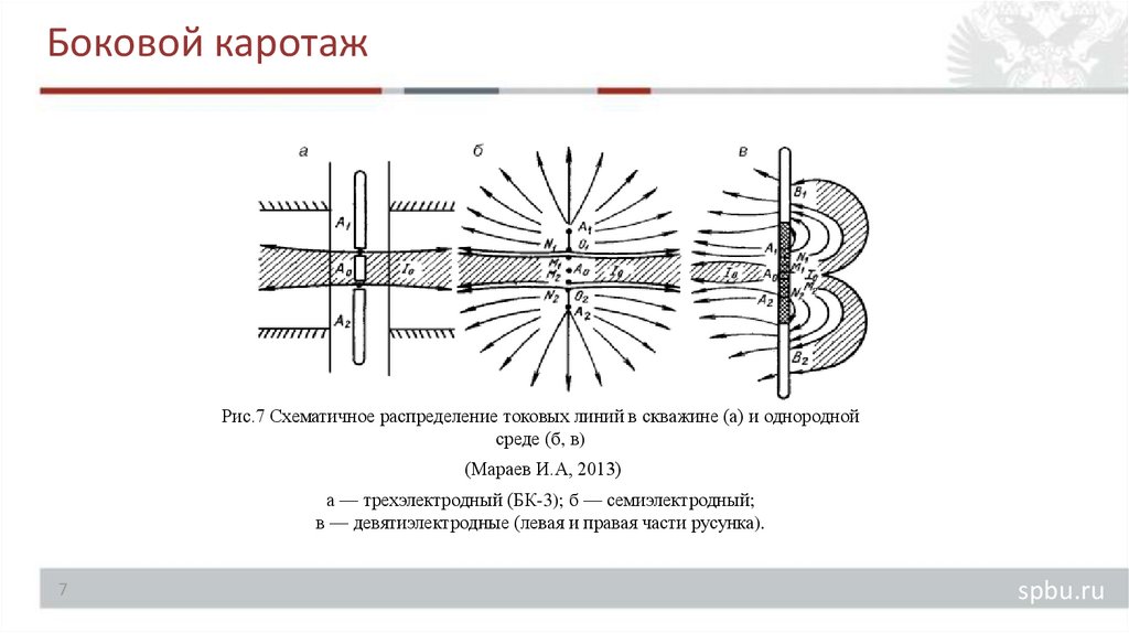 Боковой каротажРис.7 Схематичное распределение токовых линий в скважине (а) и однородной