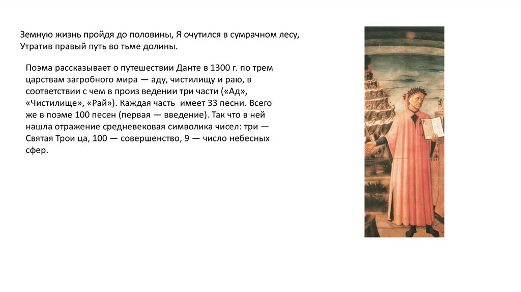 Поэма рассказывает о путешествии Данте в 1300 г. по трем