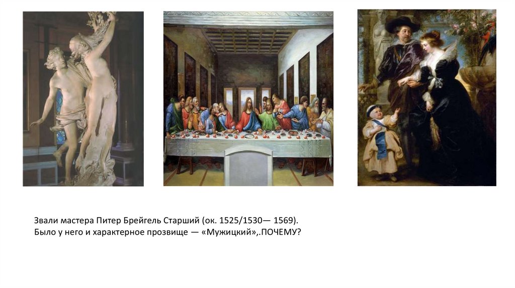 Звали мастера Питер Брейгель Старший (ок. 1525/1530— 1569).Было у него и характерное прозвище — «Мужицкий»,.ПОЧЕМУ?