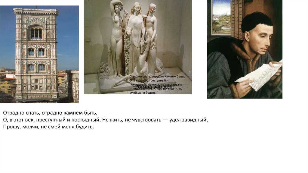 Отрадно спать, отрадно камнем быть,О, в этот век, преступный и