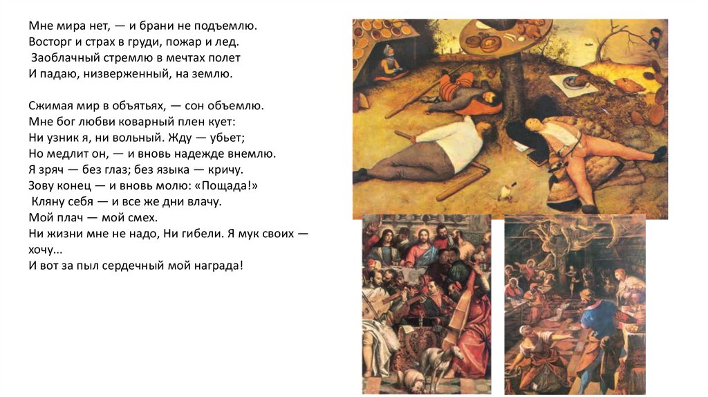 Мне мира нет, — и брани не подъемлю.Восторг и страх в груди, пожар и лед.