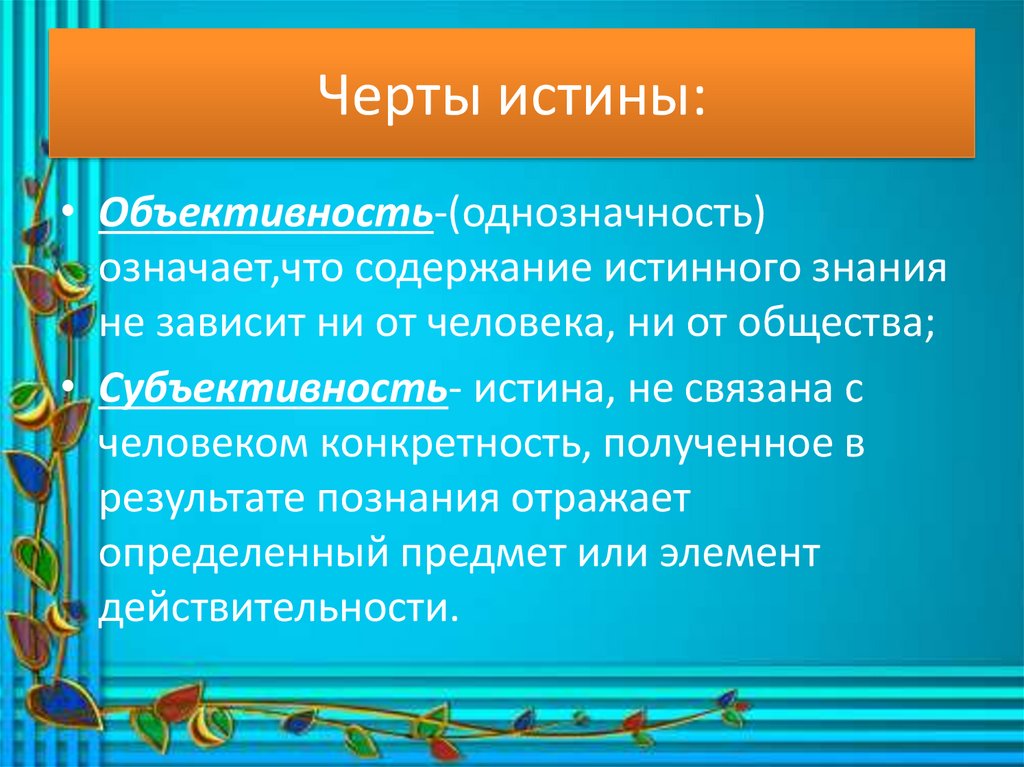 Черты истины:• Объективность-(однозначность)