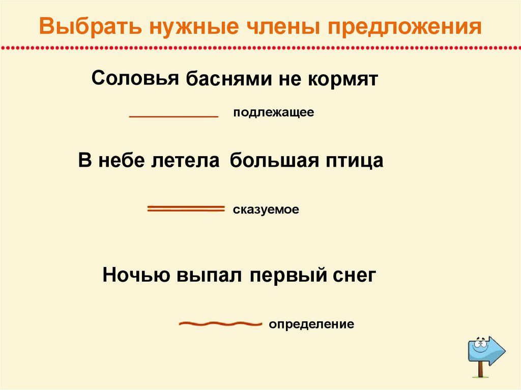 Выбрать нужные члены предложенияСоловья баснями не кормят