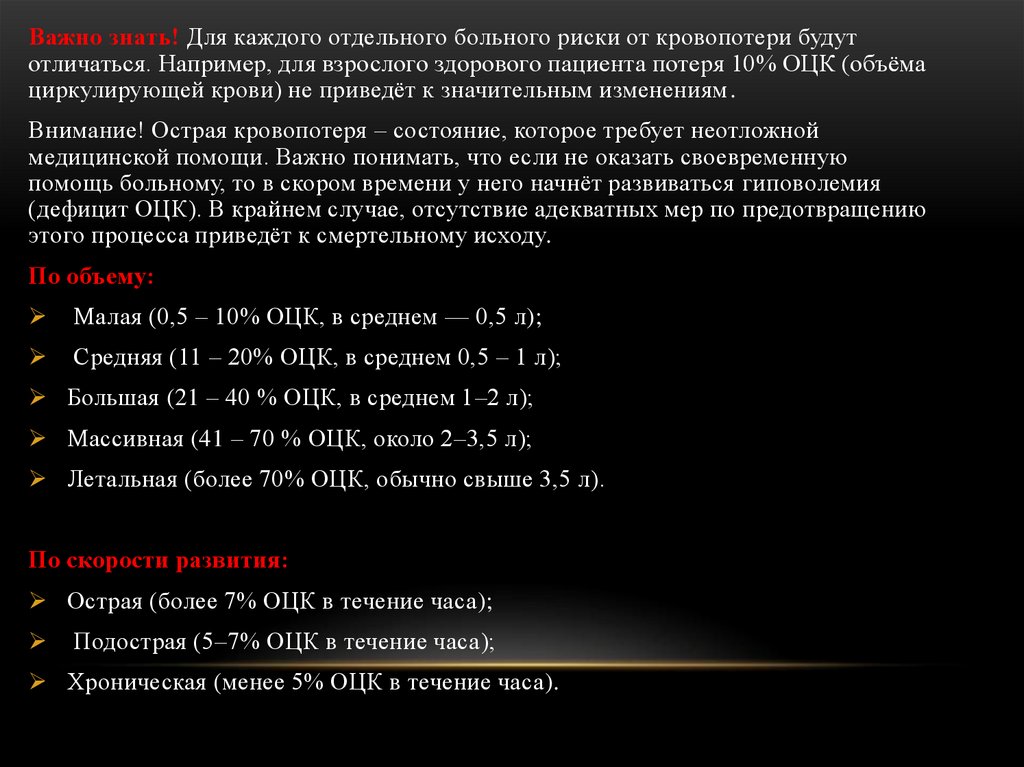 Важно знать! Для каждого отдельного больного риски от кровопотери будутотличаться. Например, для взрослого здорового пациента потеря 10% ОЦК (объёма