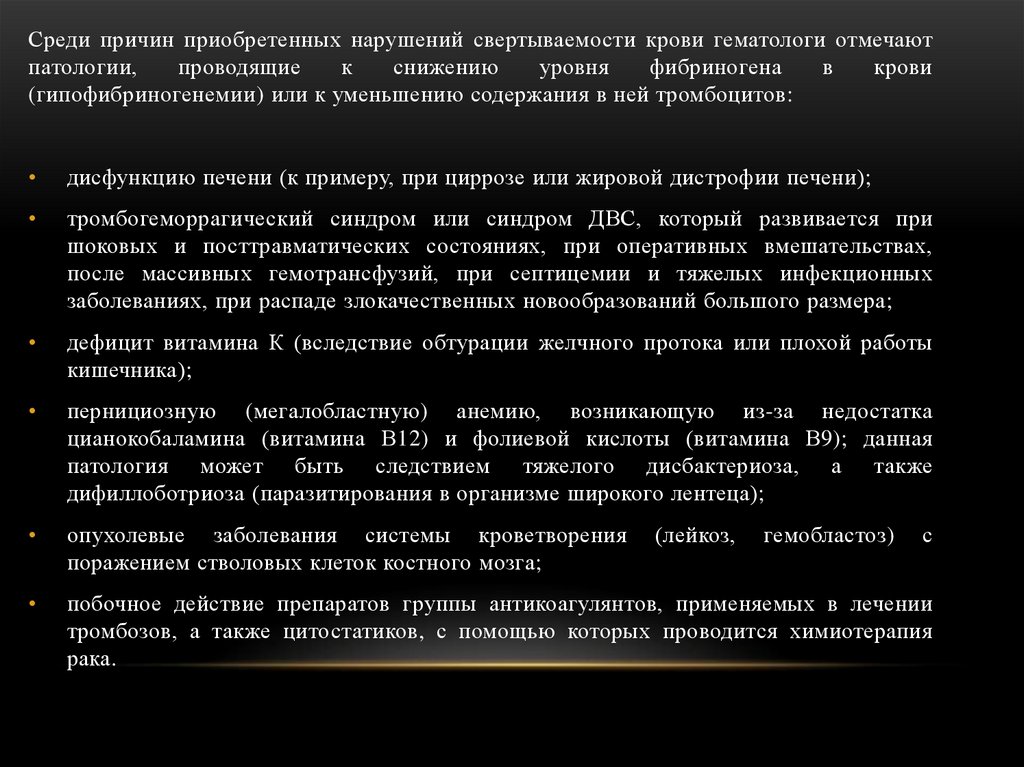 Среди причин приобретенных нарушений свертываемости крови гематологи отмечаютпатологии,
