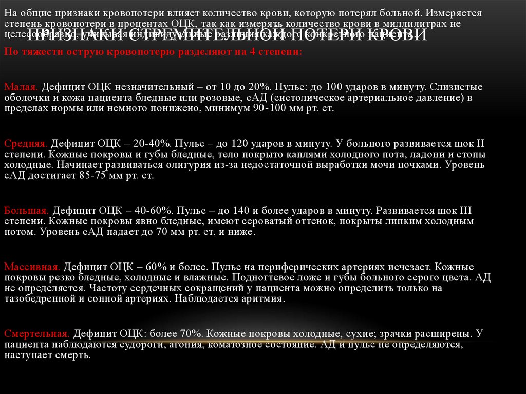 На общие признаки кровопотери влияет количество крови, которую потерял больной. Измеряетсястепень кровопотери в процентах ОЦК, так как измерять количество крови в миллилитрах не