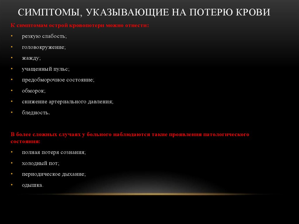 СИМПТОМЫ, УКАЗЫВАЮЩИЕ НА ПОТЕРЮ КРОВИК симптомам острой кровопотери можно отнести: