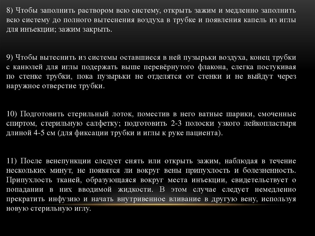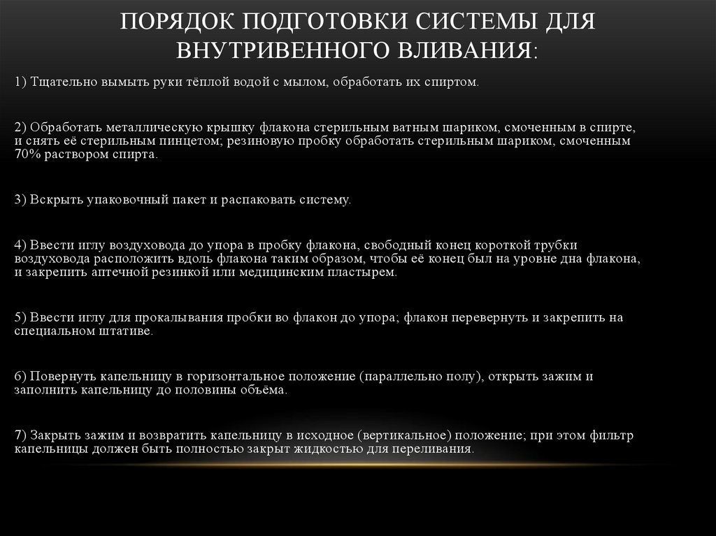 ПОДГОТОВКА СИСТЕМЫ ДЛЯ ВНУТРИВЕННОЙ ИНФУЗИИИ ПРОВЕДЕНИЕ ВНУТРИВЕННОГО ПЕРЕЛИВАНИЯ