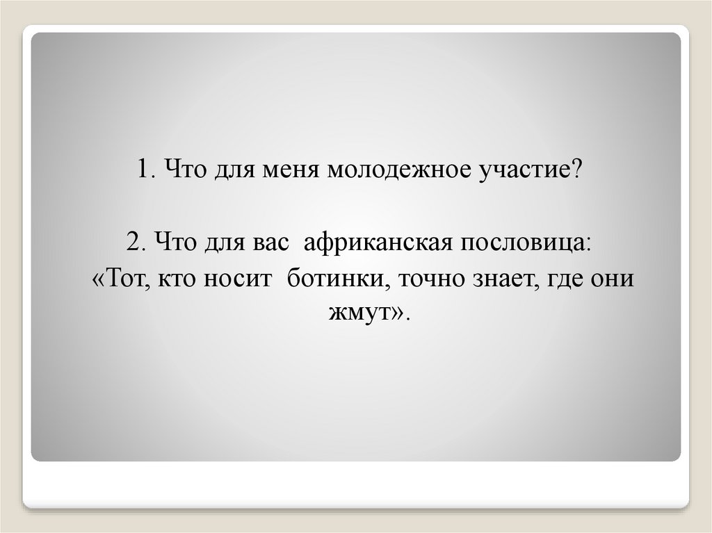 1. Что для меня молодежное участие?2. Что для вас африканская пословица: