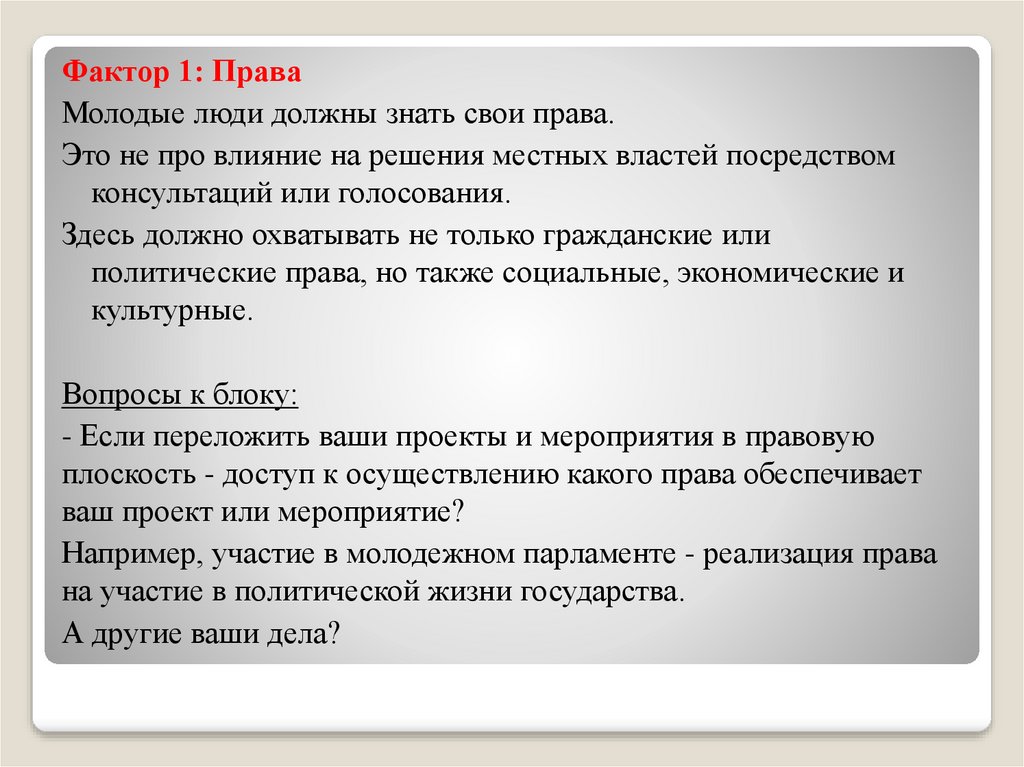 Фактор 1: ПраваМолодые люди должны знать свои права.