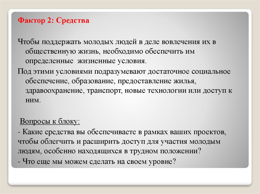 Фактор 2: СредстваЧтобы поддержать молодых людей в деле вовлечения их в