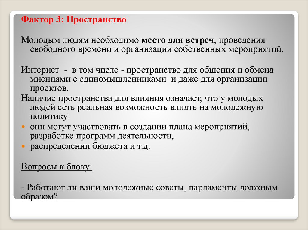 Фактор 3: ПространствоМолодым людям необходимо место для встреч, проведения