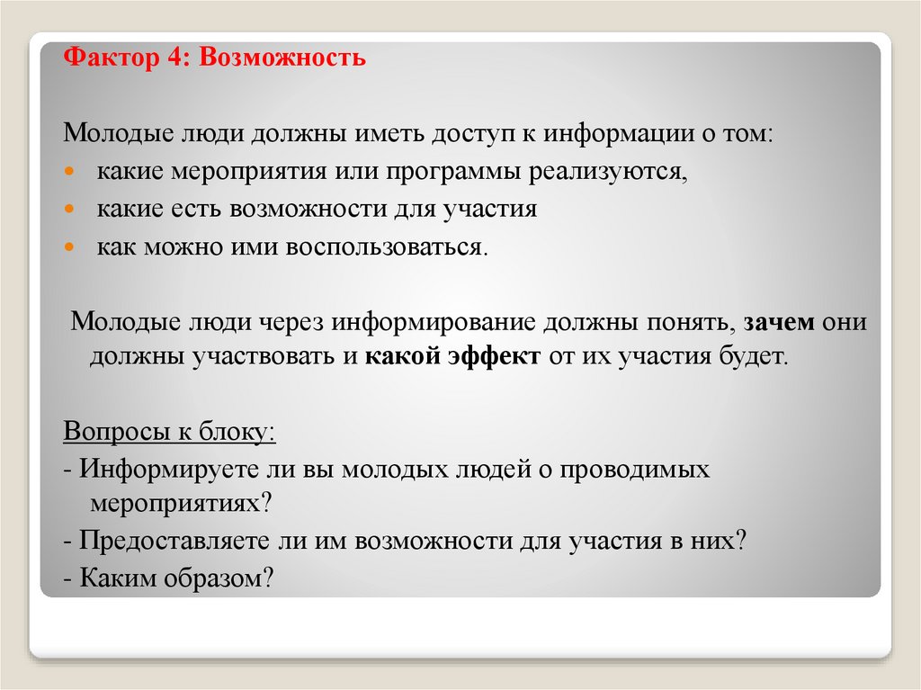 Фактор 4: ВозможностьМолодые люди должны иметь доступ к информации о том: