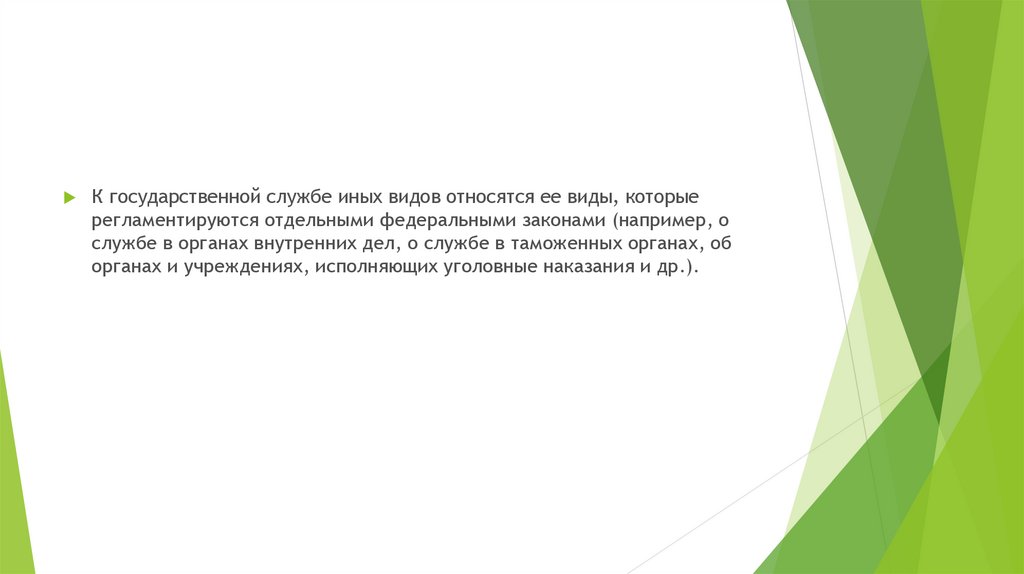 К государственной службе иных видов относятся ее виды, которыерегламентируются отдельными федеральными законами (например, о