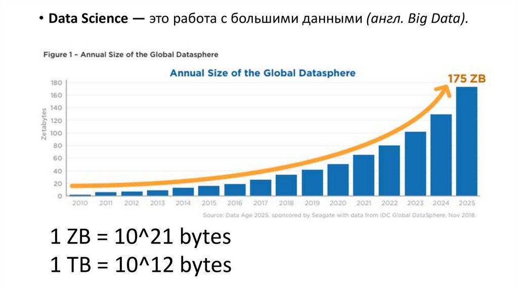 • Data Science — это работа с большими данными (англ. Big Data).1 ZB = 10^21 bytes